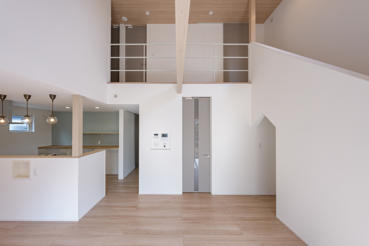 大きな吹き抜けと、たっぷりと光を取り込む窓配置により、開放感に包まれながらゆったりと過ごせる空間です。